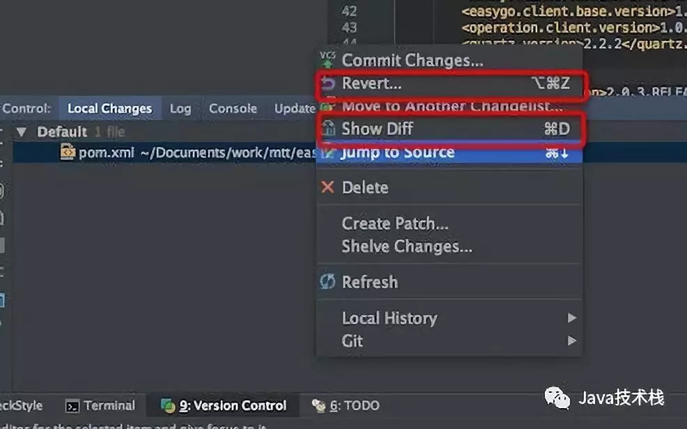 在local changes 中选中要比对的文件,右键选择show diff 便可以查看文件的变动。或者选择Revert放弃文件的改动。