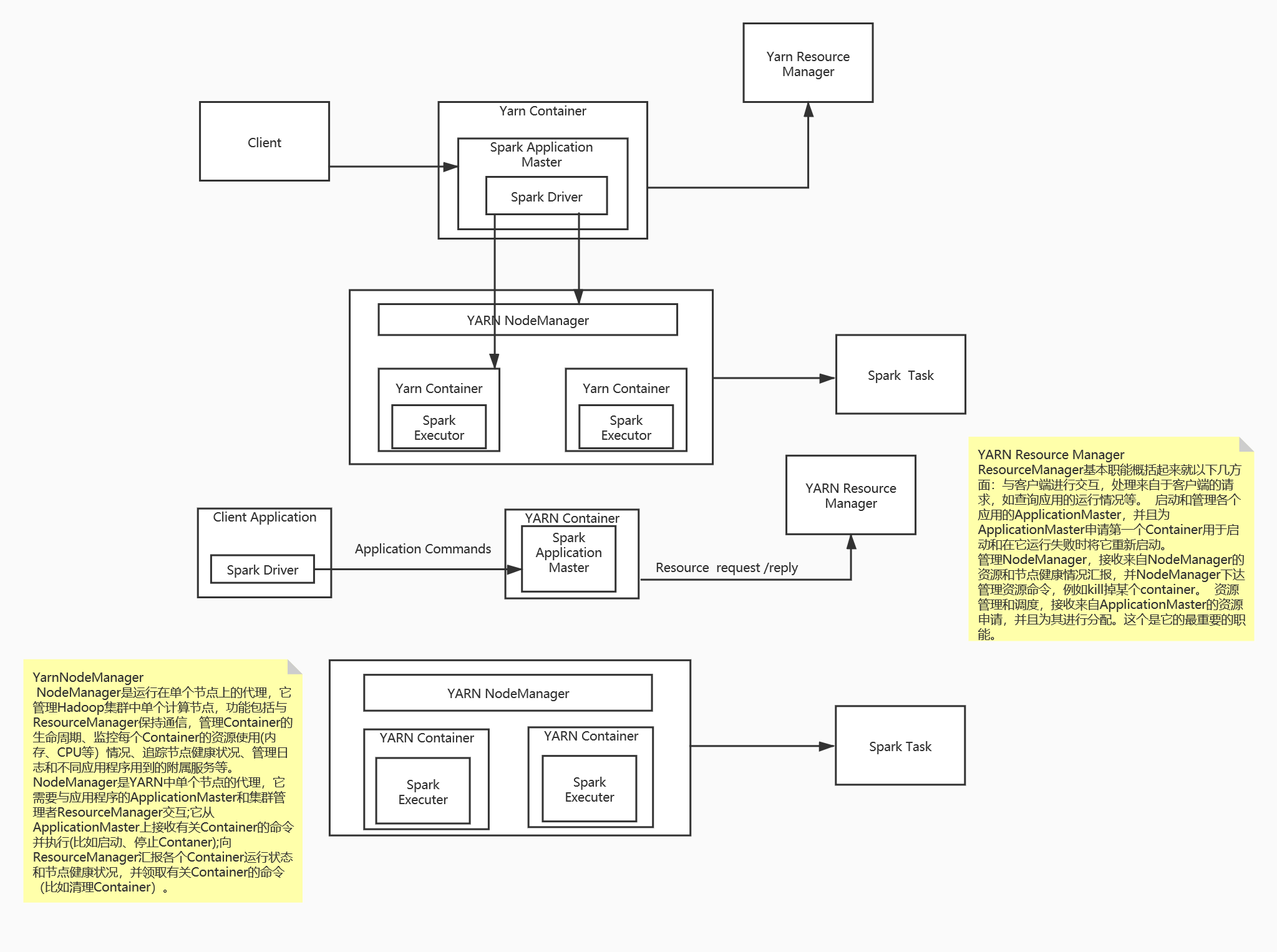 yarn-client 和 yarn cluster 的异同 1. 从广义上讲,yarn-cluster 适用于生产环境。而 yarn-client 适用于交互和调试,也就是希望快速地看到 application 的输出。2. 从深层次的含义讲,yarn-cluster 和 yarn-client 模式的区别其实就是 Application Master 进程的区别,yarn-cluster 模式下,driver 运行在 AM(Application Master)中,它负责向 YARN 申请资源,并监督作业的运行状况。当用户提交了作业之后,就可以关掉 Client,作业会继续在 YARN 上运行。然而 yarn-cluster 模式不适合运行交互类型的作业。而 yarn-client 模式下,Application Master 仅仅向 YARN 请求 executor,Client 会和请求的 container 通信来调度他们工作,也就是说 Client 不能离开。