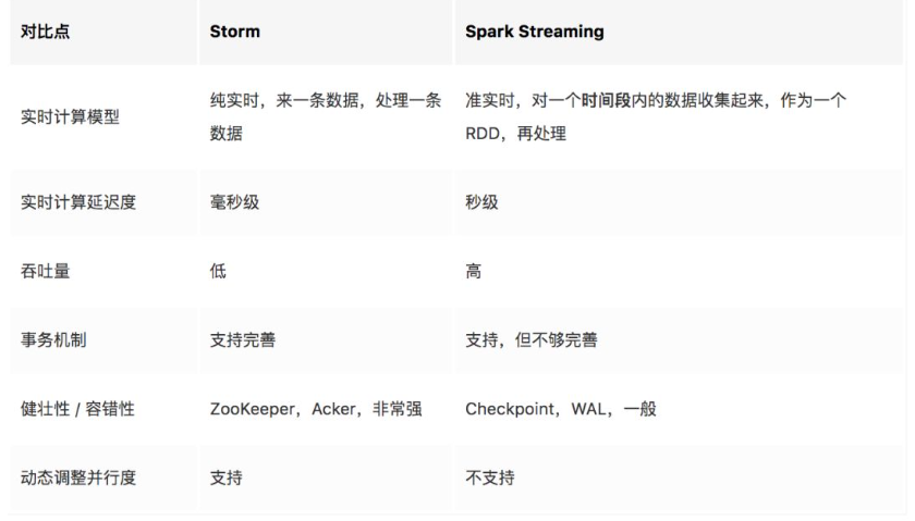 Spark Streaming 与 Storm 都可以用于进行实时流计算。但是他们两者的区别是非常大的。其中区别之一,就是,Spark Streaming 和 Storm 的计算模型完全不一样,Spark Streaming 是基于 RDD 的,因此需要将一小段时间内的,比如1秒内的数据,收集起来,作为一个 RDD,然后再针对这个 batch 的数据进行处理。而 Storm 却可以做到每来一条数据,都可以立即进行处理和计算。因此,Spark Streaming 实际上严格意义上来说,只能称作准实时的流计算框架;而 Storm 是真正意义上的实时计算框架。此外,Storm 支持的一项高级特性,是 Spark Streaming 暂时不具备的,即 Storm 支持在分布式流式计算程序(Topology)在运行过程中,可以动态地调整并行度,从而动态提高并发处理能力。而 Spark Streaming 是无法动态调整并行度的。但是 Spark Streaming 也有其优点,首先 Spark Streaming 由于是基于 batch 进行处理的,因此相较于 Storm 基于单条数据进行处理,具有数倍甚至数十倍的吞吐量。此外,Spark Streaming 由于也身处于 Spark 生态圈内,因此Spark Streaming可以与Spark Core、Spark SQL,甚至是Spark MLlib、Spark GraphX进行无缝整合。流式处理完的数据,可以立即进行各种map、reduce转换操作,可以立即使用sql进行查询,甚至可以立即使用machine learning或者图计算算法进行处理。这种一站式的大数据处理功能和优势,是Storm无法匹敌的。因此,综合上述来看,通常在对实时性要求特别高,而且实时数据量不稳定,比如在白天有高峰期的情况下,可以选择使用Storm。但是如果是对实时性要求一般,允许1秒的准实时处理,而且不要求动态调整并行度的话,选择Spark Streaming是更好的选择。