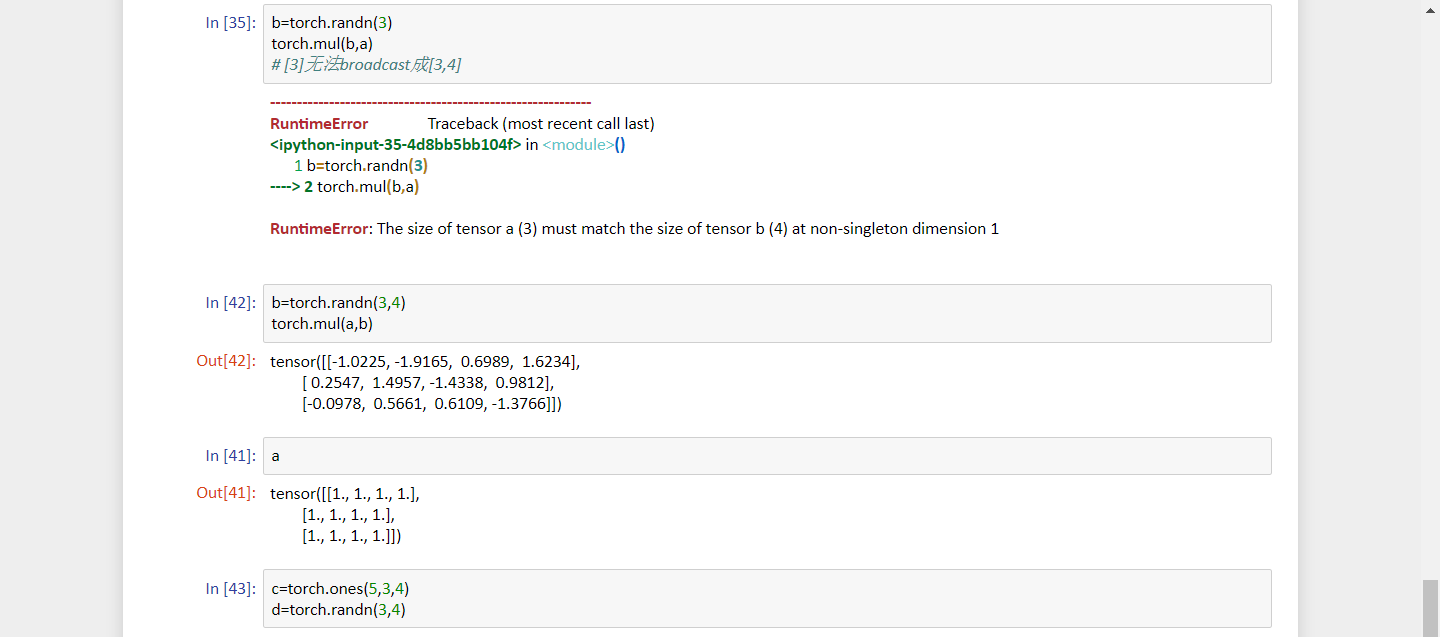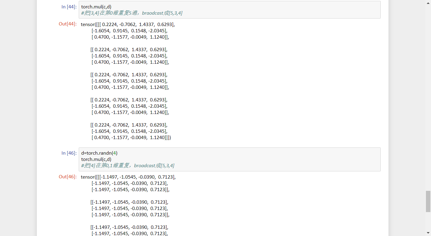 - torch.mul有broadcast机制,可以把其中一个input扩展成和另一个input维度一样的Tensor,再点乘。需要input的最后一维维数相同,例如[4]→[5,3,4],否则报错。