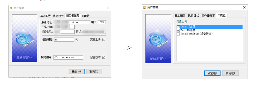 A.服务配置中在相应的地方填入设备三元组,填入产品密钥,服务地址会自动更改,扫描间隔可更改,变化上传可勾选