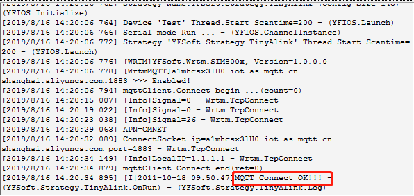 (3)在调试选项中部署YFIOs系统,选择精简版(上云),部署完成之后, 点击部署按钮,部署创建的驱动和策略,选择系统重启,根据当地网络情况,等待5~10s,设备与云端通信成功。可以在YFIOsManager监控上云过程,出现MQTT Connect OK!!! ,证明设备与云端通信成功。也可以登录阿里云查看设备是否在线。