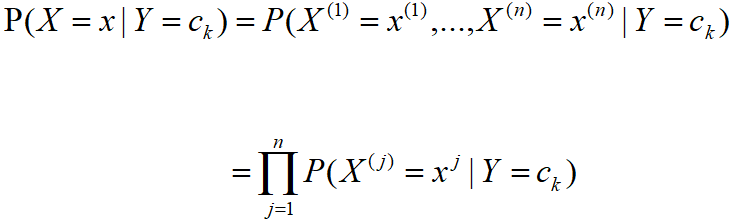 对于贝叶斯定理得分子P(X|Y),因为朴素贝叶斯对条件概率分布做了条件独立的假设(这也是朴素贝叶斯法的由来)。所以,根据条件独立假设,我们可以写为: