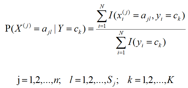 假设第j个特征xj的可能取值集合为{aj1,aj2,...,ajn},那么条件概率P(Xj=ajl|Y=ck)的极大似然估计为: