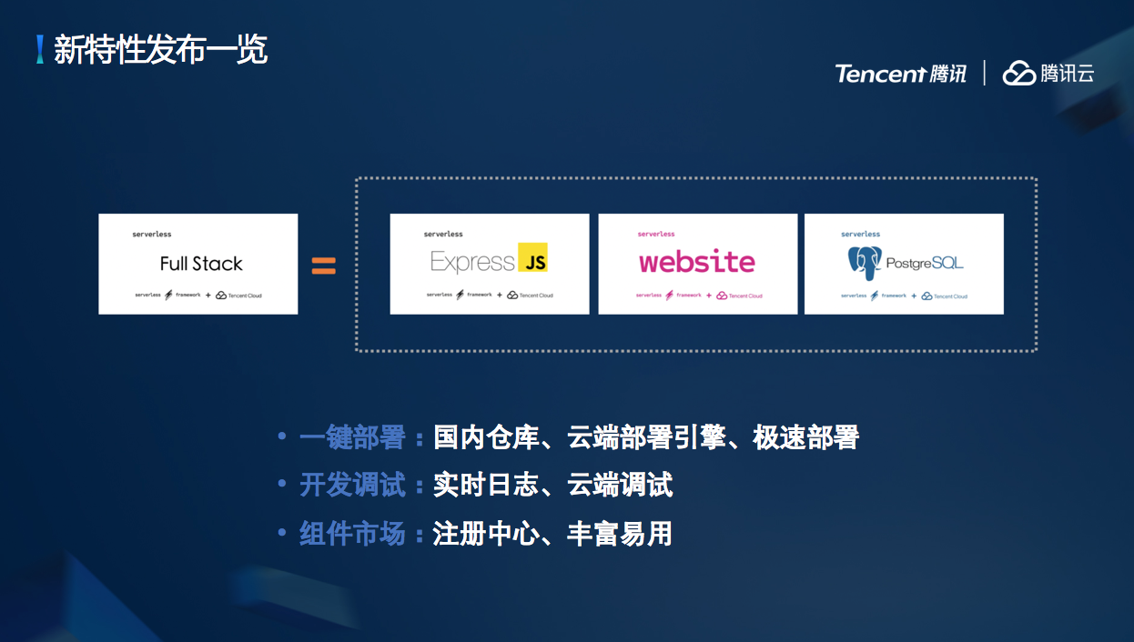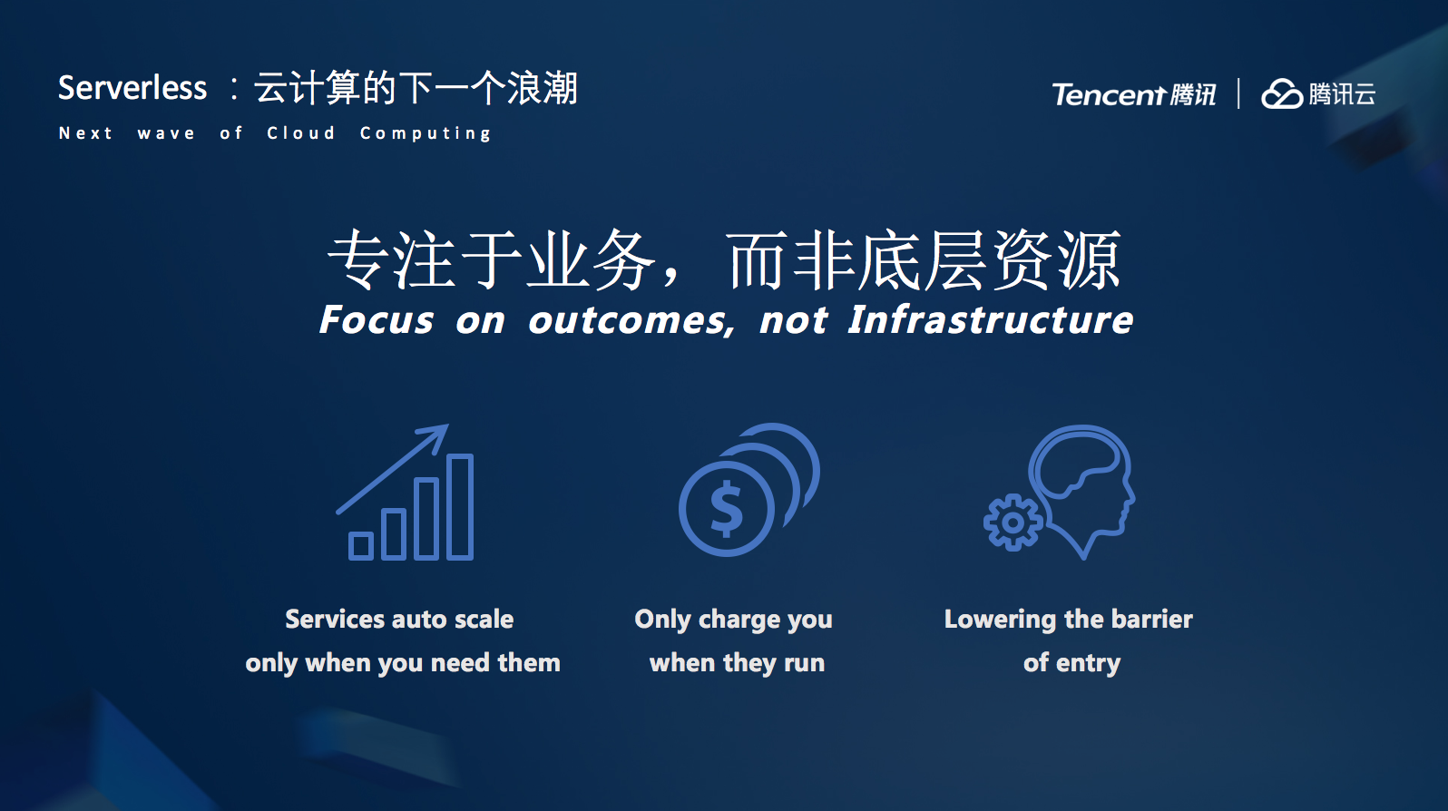 产品发布会上,首先,腾讯云中间件总经理&首席架构师 Yunong Xiao 从宏观的角度阐述了 Serverless Framework 的特性,宣布产品正式发布。他指出 Serverless 的核心价值在于聚焦业务,不需关注底层资源 (Focus on outcomes, not Infrastructure),此次产品发布,为开发者提供基于 Full Stack 全栈以及 HTTP API 的一站式解决方案。