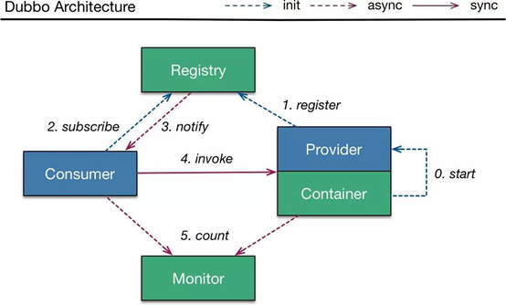 上图很好的体现了Dubbo的工作模型,由服务提供方(Provider)向注册中心(Registry)注册服务。当服务消费者(Consumer)需要使用服务时,需要先向注册中心(Registry)进行订阅,订阅后服务消费者(Consumer)就能采用同步方式(invoke)来调用该服务了。