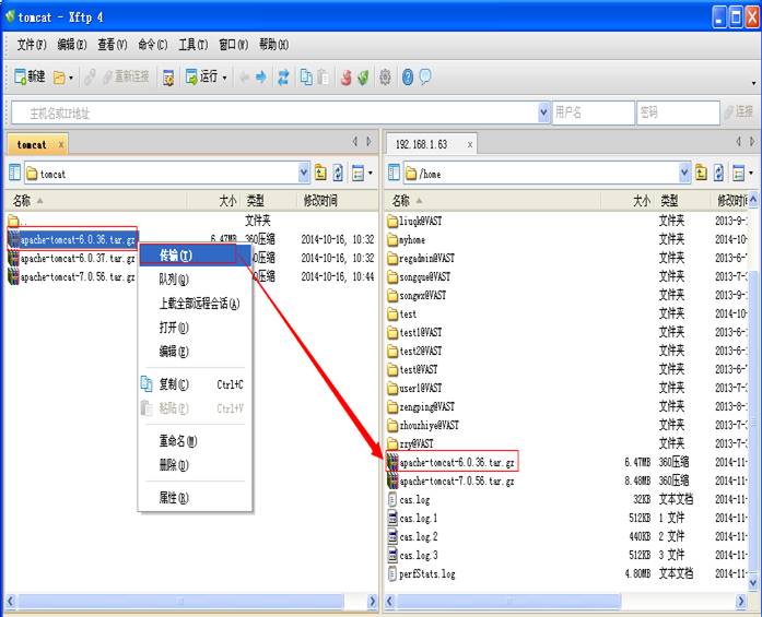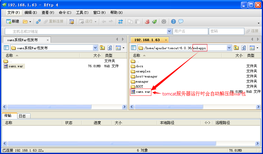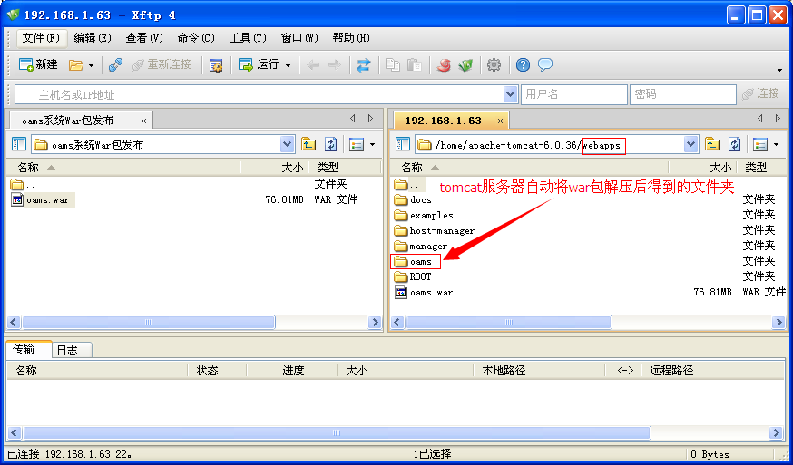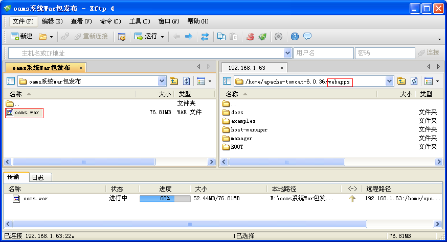 2、将打包好的war包上传到tomcat服务器的webapps目录