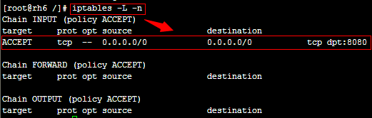 可使用"iptables –L –n"查看当前iptables规则
