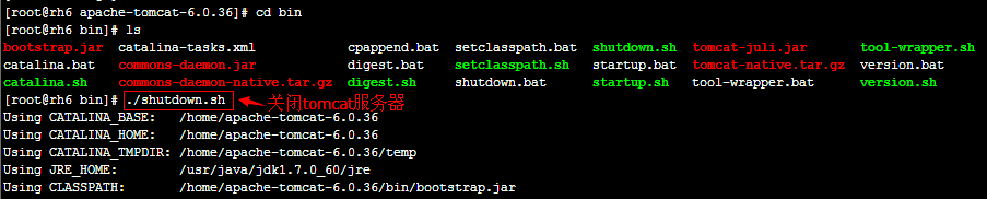 进入tomcat服务器的bin目录,然后执行"./shutdown.sh"命令启动Tomcat服务器,如下图所示: