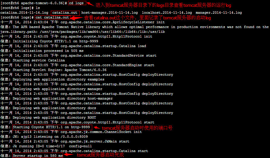 查看tomcat服务器的Log信息,看看tomcat服务器是否已经正常启动,进入tomcat服务器下的logs目录,打开catalina.out文件进行查看,如下图所示: