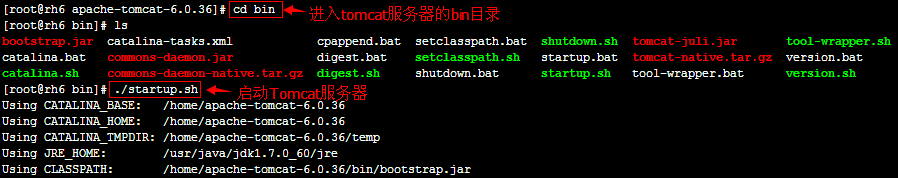 进入tomcat服务器的bin目录,然后执行"./startup.sh"命令启动Tomcat服务器,如下图所示: