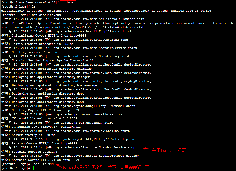 查看tomcat服务器的Log信息,看看tomcat服务器是否已经正常关闭,进入tomcat服务器下的logs目录,打开catalina.out文件进行查看,如下图所示: