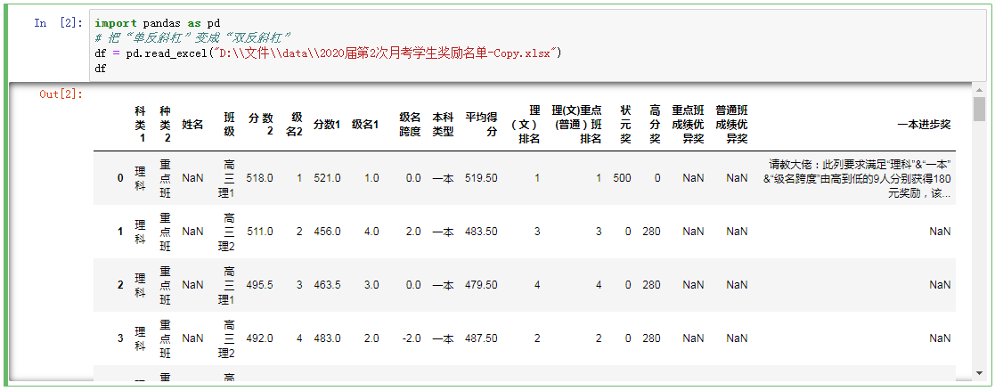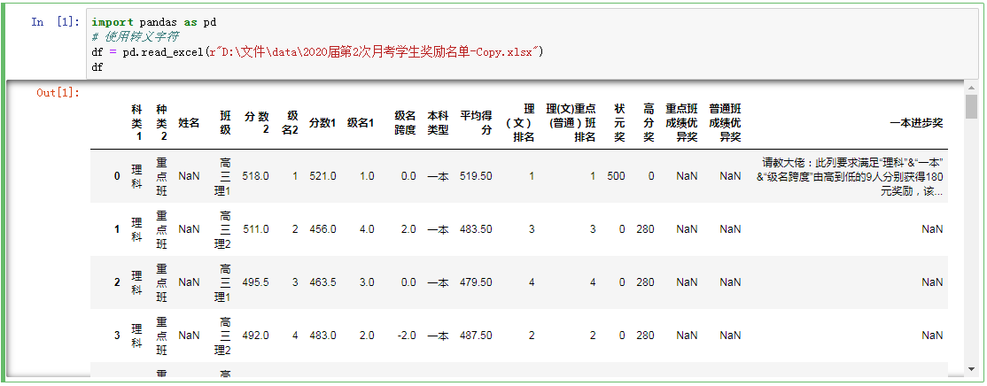 df = pd.read_excel(r"D:\文件\data\2020届第2次月考学生奖励名单-Copy.xlsx")