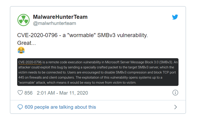 今天,Microsoft不小心泄露了有关新产品的信息 蠕虫的 Microsoft服务器消息块(SMB)协议中的漏洞(CVE-2020-0796)。