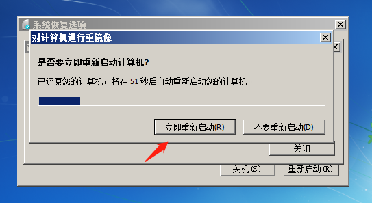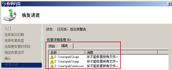 我们这里操作是重启恢复,也可以开机状态恢复,但是恢复C盘时会提醒你,“由于部分文件在使用中,恢复失败。”因为C盘的进程没有结束,所以会有警告(如下图例子)。