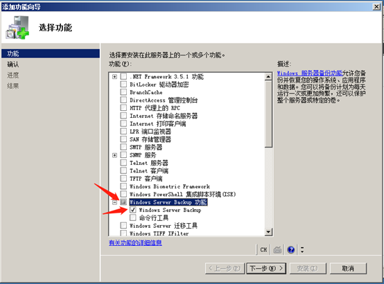 3、找到Windows Server Backup功能,勾选方框,点击下一步,点击安装即可。