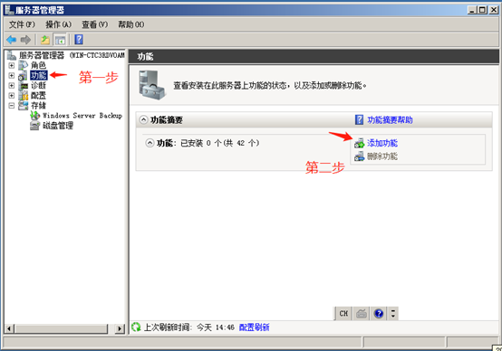 2、打开服务器管理器后,我们依次点击“功能选项”----“添加功能”。