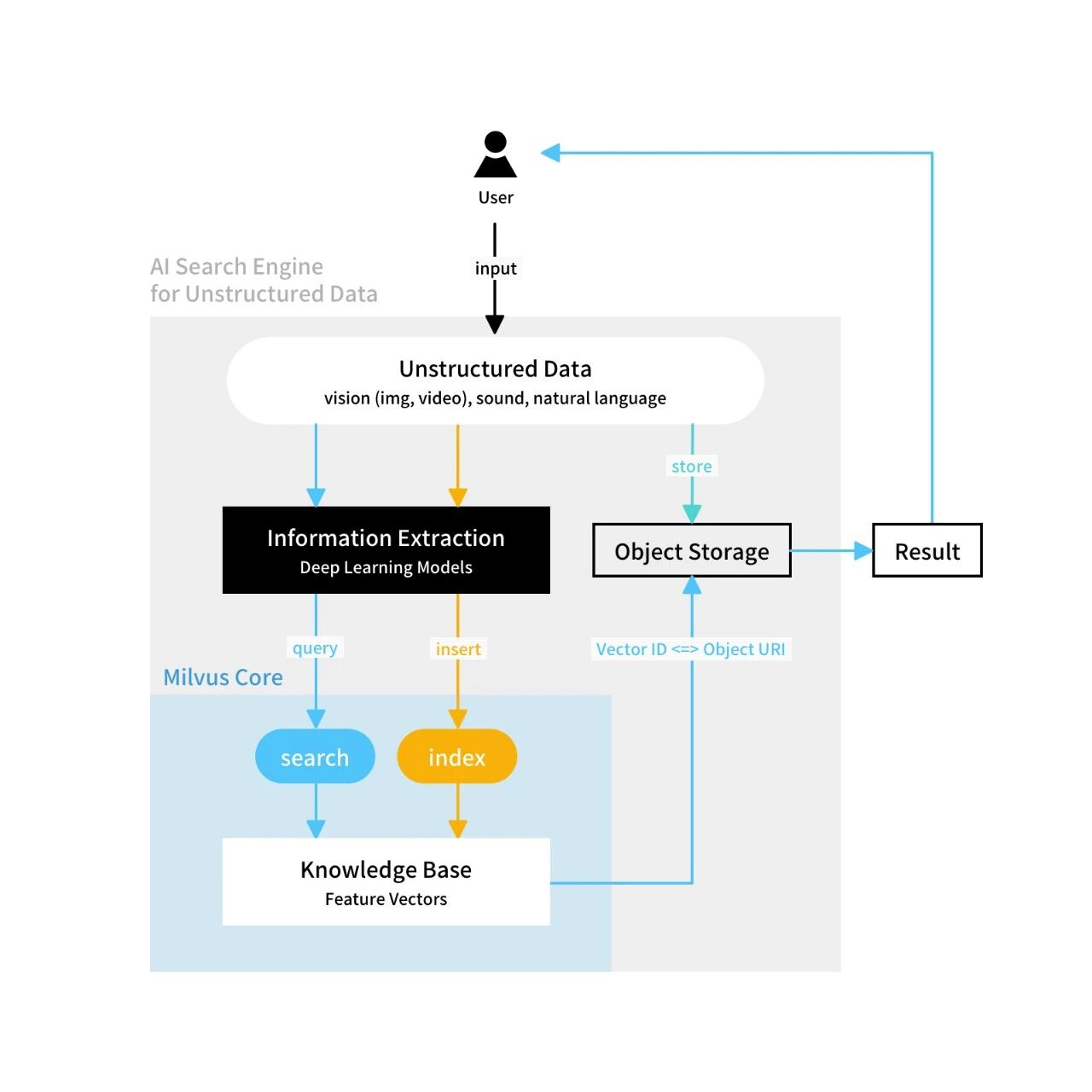 Milvus 向量相似度搜索引擎可以对接包括图像处理、机器视觉、自然语言处理、语音识别、推荐系统以及新药发现等 AI 模型,为向量化后的非结构数据提供搜索分析服务。通过深度学习模型将非结构化数据转化为特征向量导入 Milvus 库,Milvus 对特征向量进行存储并建立索引,然后在 Milvus 中进行搜索,Milvus 将返回与搜索向量相似的结果。