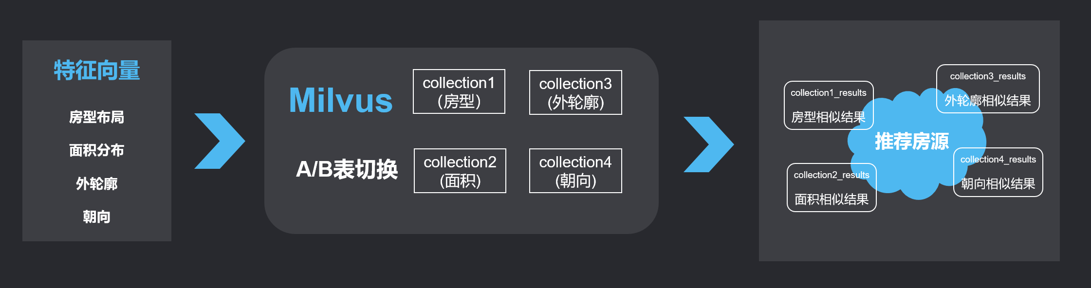 房源搜索的应用场景中,我们首先将房源信息按照不同因素(比如有关房型布局、面积分布、外轮廓等)采用机器学习模型生成不同维度的特征向量,每一套房子都会对应一组特征向量,然后根据不同的特征向量在 Milvus 中进行相似性搜索,这里每一组向量搜索的结果都是从不同角度来分析相似房型,最后综合多个向量搜索的结果最终为用户提供推荐的房源类型。