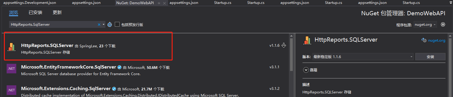 引用成功后,因为我使用的是SqlServer 数据库,我们再Nuget引用 HttpReports.SqlServer包