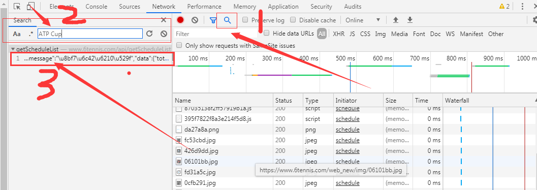 然后刷新一下网页页面,就会显示这个网页嗅探到的一些文件,只需要单击小放大镜,然后输入你需要搜索的数据(可以是JSON里面的数据或者文件名)