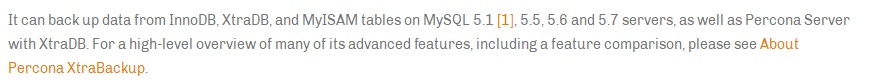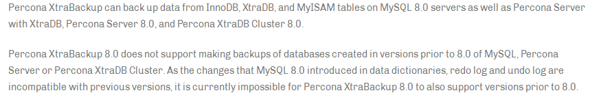 percona-xtrabackup-8.0.4只支持mysql8.0及以上版本备份,如果想备份8.0以下版本MySQL,需要下载percona-xtrabackup-2.4及以下版本