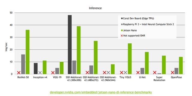 Google确实提供了一些经过预先训练的模型,你可以在其中进行微调并节省大量时间,但是不幸的是,你只能选择几种计算机视觉模型。这就是为什么英伟达的Edge TPU基准中有如此多的DNR的原因。这是英特尔和英伟达做得更好的地方。英特尔提供了很多预训练模型。有趣的是,它包括使用二进制卷积层,或通俗地说1位层的resnet50-binary-0001。英特尔的OpenVINO允许转换Tensorflow,Caffe,MxNet,Kaldi和ONNX的模型。