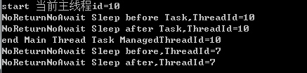 11 Console.WriteLine($"NoReturnNoAwait Sleep before,ThreadId={Thread.CurrentThread.ManagedThreadId}");