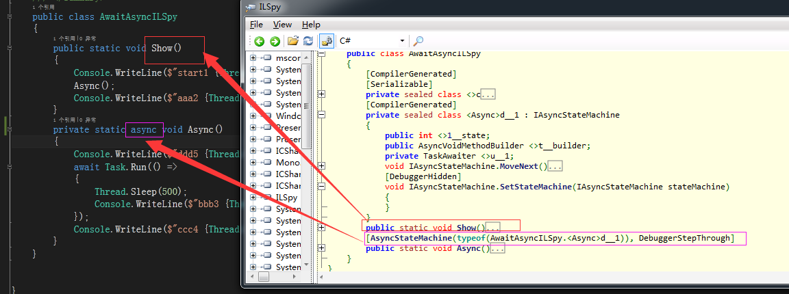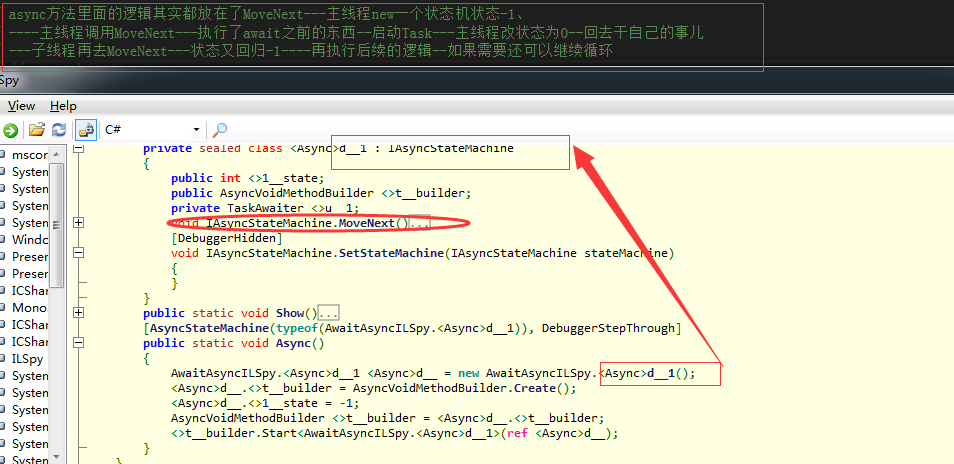 我们通过上图发现方法中加了async则会在反编译的时候增加的AsyncStateMachine状态(实现了IAsyncStateMachine接口),它实现的原理是: