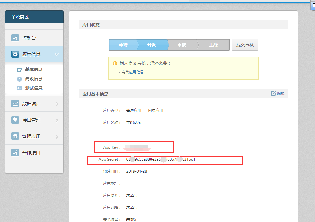 此处一些信息是很重要的东西, 比如 App_key 以及 App_Serert
