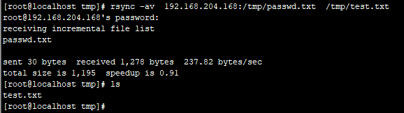 [root@localhost tmp]# rsync -av 192.168.204.168:/tmp/passwd.txt /tmp/test.txt