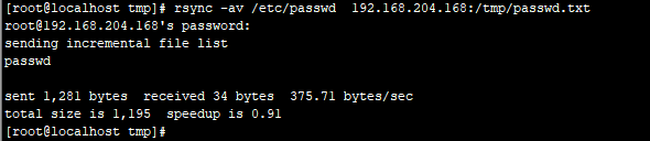 [root@localhost tmp]# rsync -av /etc/passwd 192.168.204.168:/tmp/passwd.txt