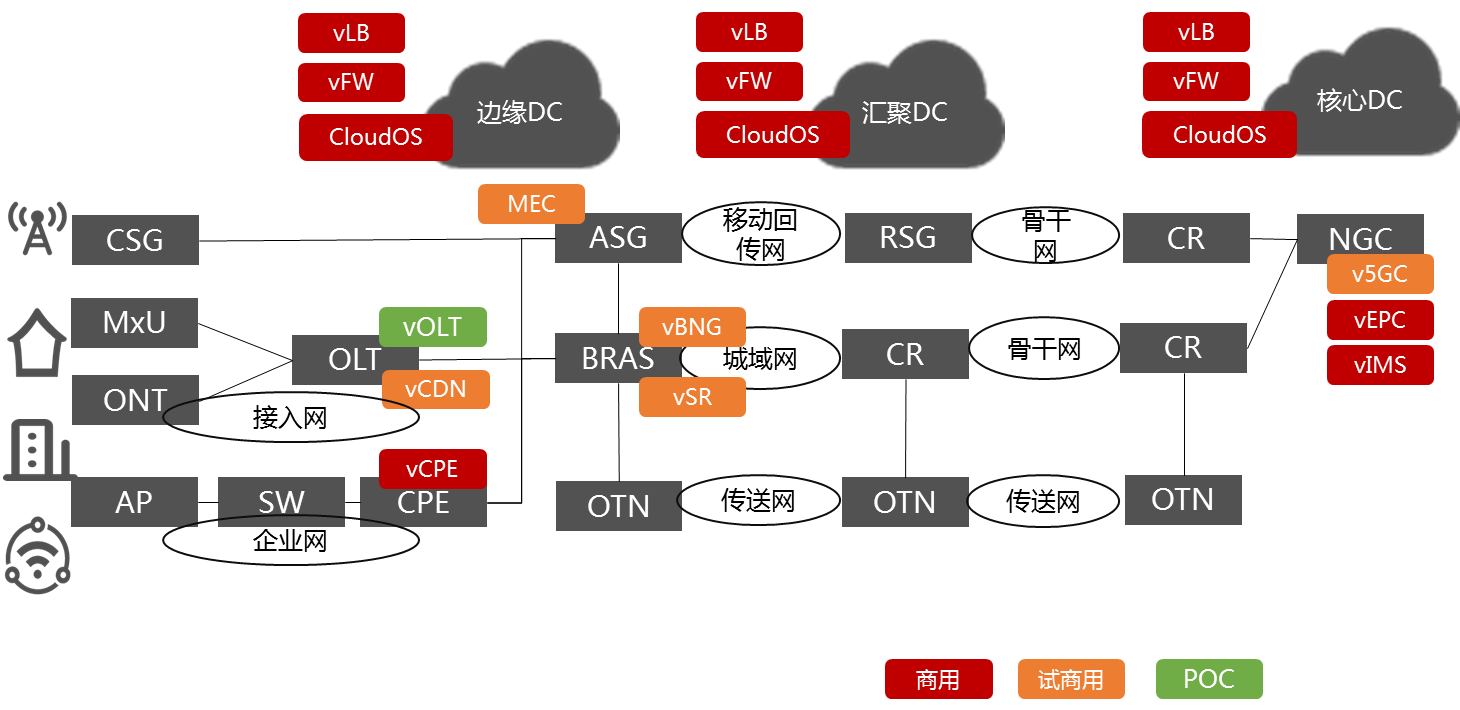 要想了解NFV产品商用进程,只要打开整个电信网络来看不同网络层次的虚拟网元商用进展就可以管中窥豹。如图1所示,除了移动核心网vEPC、vIMS、v5GC网元和数据中心网络安全等少量网元外,接入网的vCPE、vOLT、vCDN,城域网vBNG、vSR等尚处于试商用或小规模商用的阶段,传送网和骨干网的网元则几乎没有虚拟化。仔细分析不难发现其中的规律,传统电信网络中业务特性比重大的网元率先实现虚拟化并规模商用,而网络中大量管道特性比重大的网元仍然处于试商用或者干脆没有虚拟化的阶段。