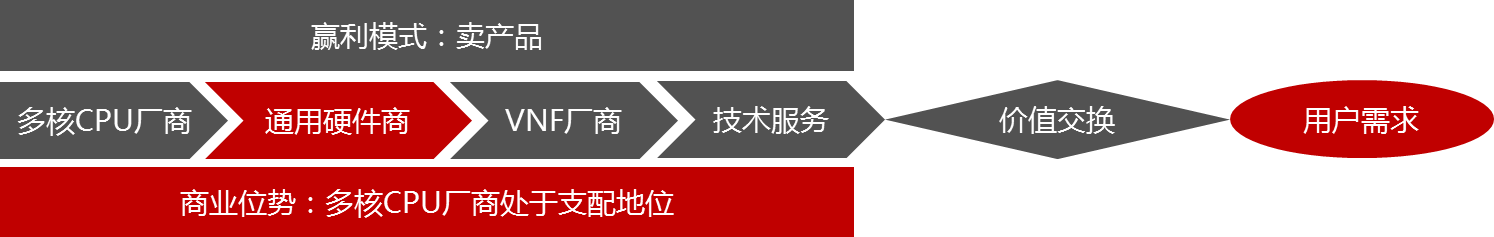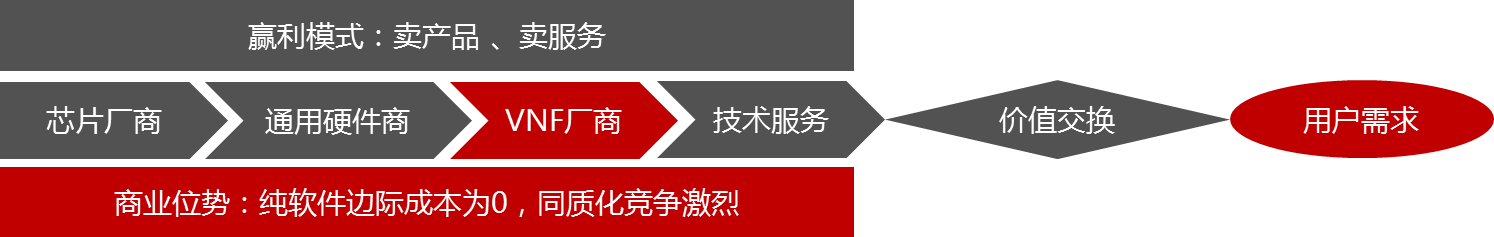 VNF的商业模式参考图4。价值链路VNF厂商处于通用硬件商下游,购买通用硬件设备并部署VNF后再销售后最终用户使用。由于纯软件边际成本为0,同质化竞争激烈,商业位势上VNF厂商无法处于支配地位。