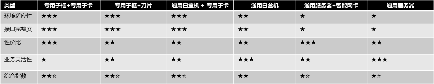多核通用CPU芯片擅长业务处理,专用芯片精于高效转发,两者优势互补,可以有效地满足现网升级改造的需求。表3总结归纳了从专用硬件到通用硬件的多种硬件形态变形。其中融合硬件包括3种典型组合,包括专用子框+多核刀片、uCPE+专用子卡、通用服务器+智能网卡的形态。融合硬件在环境适应性、接口完整性、性价比和业务灵活性上相较于通用硬件存在明显的优势,同时克服了专用硬件业务灵活性不足的劣势,因此NFV通用硬件与专用硬件融合趋势在未来3年内将会是主流。