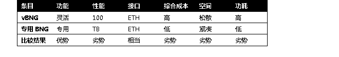 图4 VNF虚拟网元的商业模式对于购买了VNF的最终用户而言,基础层次的需求靶点就是VNF相比专用网元的优势体现在何处。以城域网vBNG网元为例,vBNG由于需要进行CO机房DC化改造,包含有设备成本和基建成本在内的综合成本明显高于专用BNG。表2将vBNG与专用BNG网元进行了对比分析,vBNG在综合成本、性能、环境适应性、空间和功耗方面均不占优势。