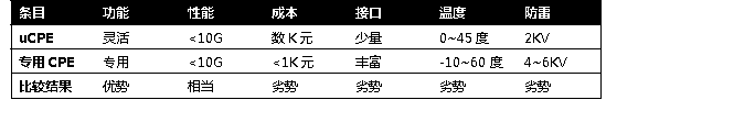 图3 NFV通用硬件的商业模式对于购买NFV通用硬件的最终用户而言,基础层次的需求靶点就是通用硬件相比专用硬件优势在何处。以uCPE为例,表1从不同维度比较了uCPE和专用CPE的差异,uCPE在接口多样性、成本、环境适应性等多方面相较于专用CPE均没有体现明显优势。