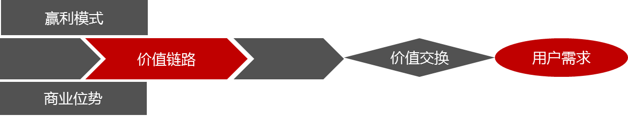 图2 商业模式分析框架商业模式的概念是商业生态环境中价值环节的生态组合。商业模式分析框架主要由用户需求、价值链路、价值交换、赢利模式和商业位势组成。用户需求指使用产品或服务的最终用户的需求。运用马斯洛需求层次理论模型可以锁定用户需求靶点。价值链路由一个或多个价值环节组成,通过价值交换的方式交换到用户处并满足用户需求。赢利模式指价值链路上总收益的生成方式,本质上就是研究卖什么的问题,通常包括卖产品、卖服务、卖文化、卖投资和卖资质五种类型。商业位势指企业在价值链路上的收益分配原则,通常根据关键资源的可替代性决定了企业在价值链路上的位势。