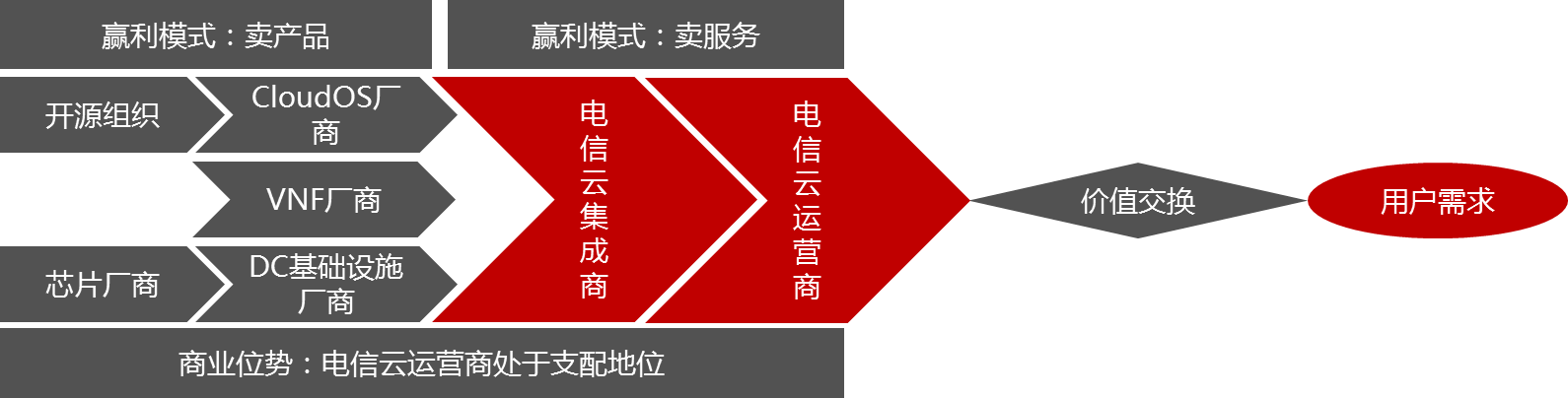 图5 电信云CloudOS的商业模式对于CloudOS厂商而言,最终用户实际是电信云运营商。运营商的基础需求靶点是CloudOS的特性满足VNF部署需要。在此之上是电信云建设需求,中小运营商没有足够的专业知识,需要集成商提供电信云数据中心工程交钥匙服务。在建设需求之上则是运维需求,运营商积累多年的IT云运维经验需要无缝切换到电信云上,这就要求CloudOS提供IT云和电信云统一的运维界面和工具。