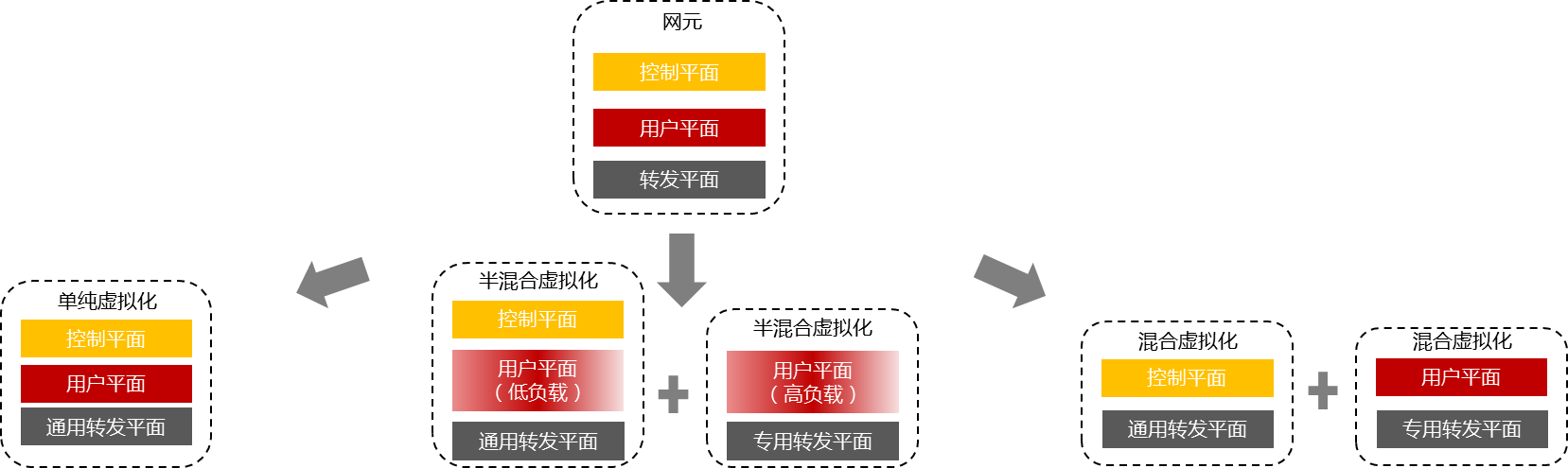 如图7所示,与硬件走向融合趋势相适应,虚拟网元也从单纯虚拟化向混合虚拟化形态演进。混合虚拟化形态的网元将转发面或者部分转发面特性卸载到专用网元上实现,充分发挥专用网元转发性能优势,适用于需要100G以上转发带宽的网络层次部署。