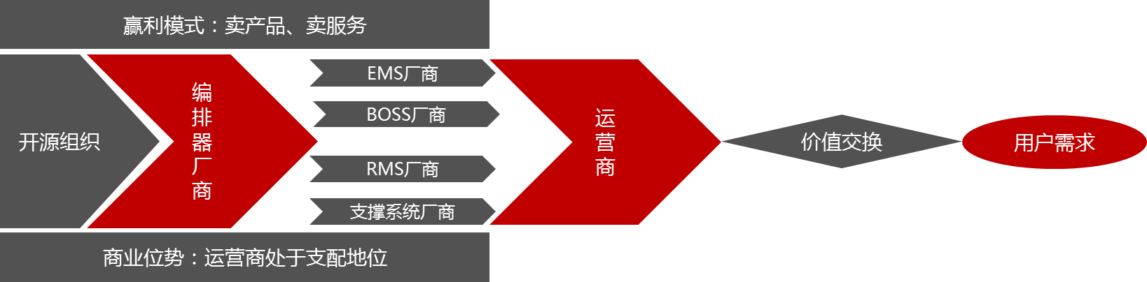 电信云CloudOS部署在通用硬件之上,基于虚拟化技术提供VM或容器来运行VNF软件。电信云CloudOS的商业模式参考图5。价值链路上CloudOS厂商下游是电信云集成商和运营商。运营商销售云服务和产品给最终用户。由于电信云运营商需要投资建设数据中心等基础设施,因此运营商是关键资源的支配者,在商业位势上处于支配地位。大量基于OpenStack等开源项目打造的CloudOS供应商和集成商竞争激烈。