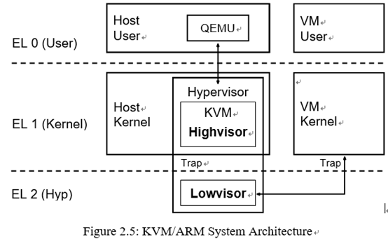这是通过将虚拟机管理程序拆分为两个组件(lowvisor和highvisor)来完成的,如图2.5所示。 lowvisor旨在利用Hyp模式中提供的硬件虚拟化支持来提供三个关键功能。首先,lowvisor通过适当的硬件配置来设置正确的执行上下文,并在不同的执行上下文之间实施保护和隔离。 lowvisor直接与硬件保护功能交互,因此非常关键,代码库保持在绝对最小值。其次,lowvisor从VM执行上下文切换到主机执行上下文,反之亦然。主机执行上下文用于运行管理程序和主机Linux内核。主机执行上下文和VM执行上下文之间的转换通常被称为世界交换,因为整个内核和用户模式配置被更改,给人以在世界之间移动的印象。由于lowvisor是唯一在Hyp模式下运行的组件,因此只有它可以负责执行世界切换所需的硬件重配置。第三,lowvisor提供了一个虚拟化陷入处理程序,它处理必须陷入虚拟机管理程序的中断和异常。低级管理程序仅执行所需的最少量处理,并且在世界切换到高级管理程序完成后,将大部分工作推迟到高级管理员。