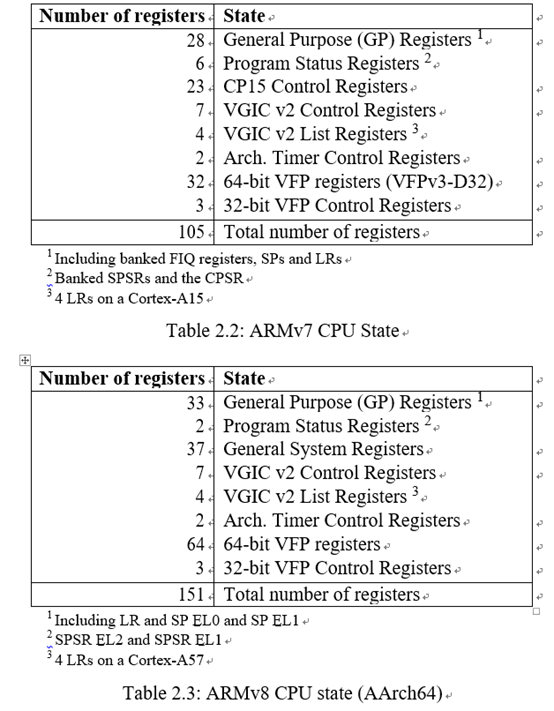 表2.2和表2.3显示了在主机和VM上以内核和用户模式运行的软件可见的CPU状态,在VM和主机之间切换时必须进行上下文切换。Number of register指定了每种类型的寄存器数量。当从VM转换到主机时,这些寄存器中的每一个都可以被读取和写入,反之亦然。比如说任何的通用寄存器。KVM / ARM必须首先读取VM的GP寄存器状态并将其存储到存储器,然后将主机的GP寄存器状态从存储器加载到寄存器,然后返回到highvisor。返回VM后,KVM / ARM必须再次读取主机的GP寄存器状态并存储内存,最后将VM的GP寄存器状态从内存加载到寄存器,然后返回VM。无论每个寄存器被访问多少次,表2.2和2.3都会对每个寄存器进行一次计数。此外,这些表仅包括在VM中的正常操作下运行工作负载的最小寄存器集,但不包括更高级的功能,例如使用性能监视单元(PMU)监视VM中的性能或调试VM。