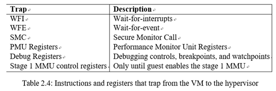 KVM / ARM对某些敏感指令和寄存器访问执行陷入,如表2.4所示。如果VM执行WFI指令导致CPU断电,则KVM / ARM陷入。因为此类操作应只能由管理程序执行以维持对硬件的控制。当物理CPU are oversubscribed 的时候,KVM/ARM执行WFE会陷入。因为由于WFE指令通常用于自旋锁循环,发出指令的guest虚拟机很好地表明VM中的锁是争用的,并且在允许保持VCPU运行之前不会释放。对于超额订购的CPU,运行的VCPU多于物理CPU,KVM / ARM通过调度另一个VCPU来处理来自WFE的陷入。SMC指令被捕获,因为不应允许VM与系统上的任何安全运行时进行交互,但是这些访问应该由hypervisor.模拟。DEBUG和PMU寄存器被捕获,因为性能监视单元和调试硬件属于主机操作系统,并且不支持虚拟化和虚拟机管理程序,因此可以捕获和模拟访客对这些资源的访问。最后,当最初启动VM时,KVM / ARM会捕获对VM的第1阶段MMU控制寄存器的访问权限,并且上下文也会切换这些寄存器,因为虚拟机管理程序必须能够检测VM何时启用第1阶段MMU并执行所需的缓存维护确保guest的连贯内存视图。客户操作系统启用第1阶段MMU后,将禁用陷入,VM可以直接访问MMU控制寄存器。