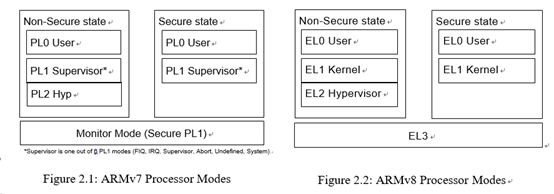 ARMv7和ARMv8 CPU保护机制之间的差异不会影响虚拟机管理程序设计,但我强调了完整性的重要变化。差异主要涉及非安全和安全世界与命名之间的相互作用。在ARMv7上,在监控模式下运行时的权限级别是安全PL1,因此监控模式不比PL1内核模式更具特权。在ARMv8上,EL3是一种比安全EL1更具特权的模式。例如,ARMv8定义了几个系统寄存器,这些寄存器只能从EL3访问而不能从安全EL1访问。这种特殊的差异会影响固件如何配置非安全世界的实现,但不会影响仅限于非安全状态的虚拟机管理程序的设计。 ARMv7定义了多个PL1模式;实际上有六种PL1模式,Supervisor,Abort,Undefined,FIQ,IRQ和System。这些模式共享相同的权限级别,但具有许多专用寄存器,例如它们自己的堆栈指针。系统模式很特殊,因为它与用户模式共享相同的寄存器,但在PL1上运行。 ARMv8消除了每个权限级别的多个模式,并降低了单个概念(异常级别)的复杂性。因此,ARMv8有三种非安全CPU模式,EL0,EL1和EL2。当ARMv7中首次引入虚拟化扩展时,虚拟机管理程序CPU模式被命名为Hyp模式,但是当后来引入ARMv8并且只有异常级别的概念时,等效的异常级别称为EL2。因此,我在本文中可互换地使用术语Hyp模式和EL2来指代CPU的管理程序执行模式。