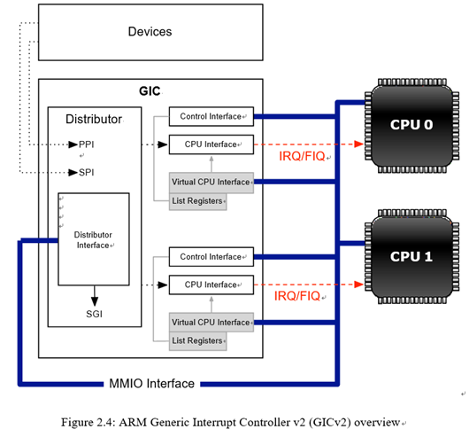 图2.4显示了使用虚拟化扩展的GICv2的简化概述。 GIC中有三种类型的中断:专用外设中断(PPI),共享外设中断(SPI)和软件产生的中断(SGI)。器件可以向PPI发送PPI或SPI信号,只有每个SPI有一条中断线,每个处理器的每个PPI都有一条线,它们的中断号分配不同。例如,每个CPU可能有一个定时器,并且定时器中断与PPI相关联,因此它可以使用相同的中断号独立地向CPU发送信号。由于希望将IPI从一个CPU发送到另一个CPU的CPU的MMIO命令,SGI从GIC分配器内生成。分发器维护每个中断的状态和配置,并将挂起和启用的中断转发到接收CPU的CPU接口。 CPU接口使用IRQ和FIQ线路向CPU发出信号,但也可以通过MMIO从CPU访问它们,以确认和停用中断。直接在硬件上运行的操作系统访问真实的CPU接口,但VM中的客户操作系统访问虚拟CPU接口。由于GICv2访问都基于MMIO,因此管理程序使用第2阶段页表来确保VM只能访问虚拟CPU接口,并且VM无法访问控制接口。图2.4中显示的MMIO路径(由粗蓝线表示)显示了VM和管理程序配置,其中CPU在执行管理程序时访问管理程序控制接口,并在运行VM时访问虚拟CPU接口。列表通过管理程序控制接口进行控制,将内容提供给虚拟CPU接口,CPU在运行VM时会观察到这一点。