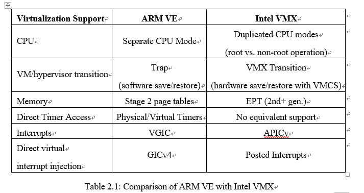 ARM虚拟化扩展与来自Intel和AMD的x86的硬件虚拟化支持之间存在许多相同点和不同点。 Intel VMX [50]和AMD-V [2]非常相似,因此我们将其与ARM VE和Intel VMX的比较限制在一起。差异总结在表2.1中。 ARM通过单独的CPU模式Hyp模式支持虚拟化,Hyp模式是一种独立且严格更高权限的CPU模式,而不是之前的用户和内核模式。相比之下,英特尔具有root和非root模式[50],它们与CPU保护模式正交。虽然ARM上的敏感操作陷阱到Hyp模式,但敏感操作可以从non-root模式陷入root模式,同时在Intel上保持相同的保护级别。两种硬件设计之间的关键区别在于,英特尔的根模式支持与非根模式相同的全范围用户和内核模式功能,而ARM的Hyp模式是一种严格不同的CPU模式,具有自己的一组功能。例如,在Intel根模式下执行的软件使用与在非根模式下执行的软件相同的虚拟内存系统和相同的虚拟地址布局。在ARM上,Hyp模式使用不同的页表,并且与内核模式相比具有有限的VA空间。这些差异表明,英特尔想象任何软件堆栈,类似于现有的操作系统,以root和非root模式运行,其中ARM想象一个较小的独立虚拟机管理程序以root模式运行。