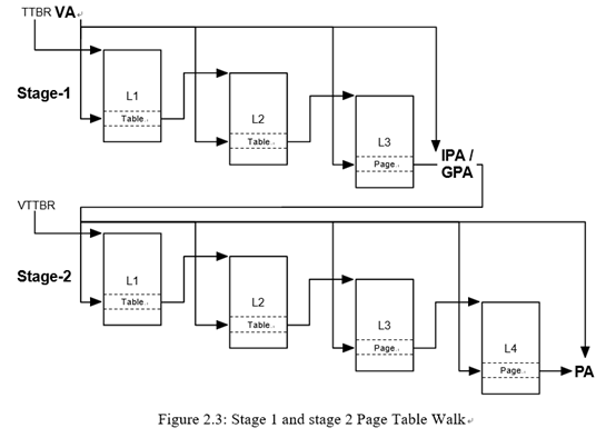 ARM体系结构通过单个地址转换阶段提供虚拟内存支持,该阶段转换使用页表将虚拟地址转换为物理地址。 虽然可以在VM的上下文中重用现有的虚拟内存支持,但它需要捕获VM对虚拟内存控制寄存器的访问并构建影子页表。 已知影子页表会增加性能开销并显着增加实现复杂性[1]。 因此,让VM管理自己的虚拟内存结构而不会陷入虚拟机管理程序,同时允许虚拟机管理程序完全控制物理内存资源非常重要。 通过在管理程序的控制下在硬件中实现第二阶段的地址转换,可以满足这两个要求。