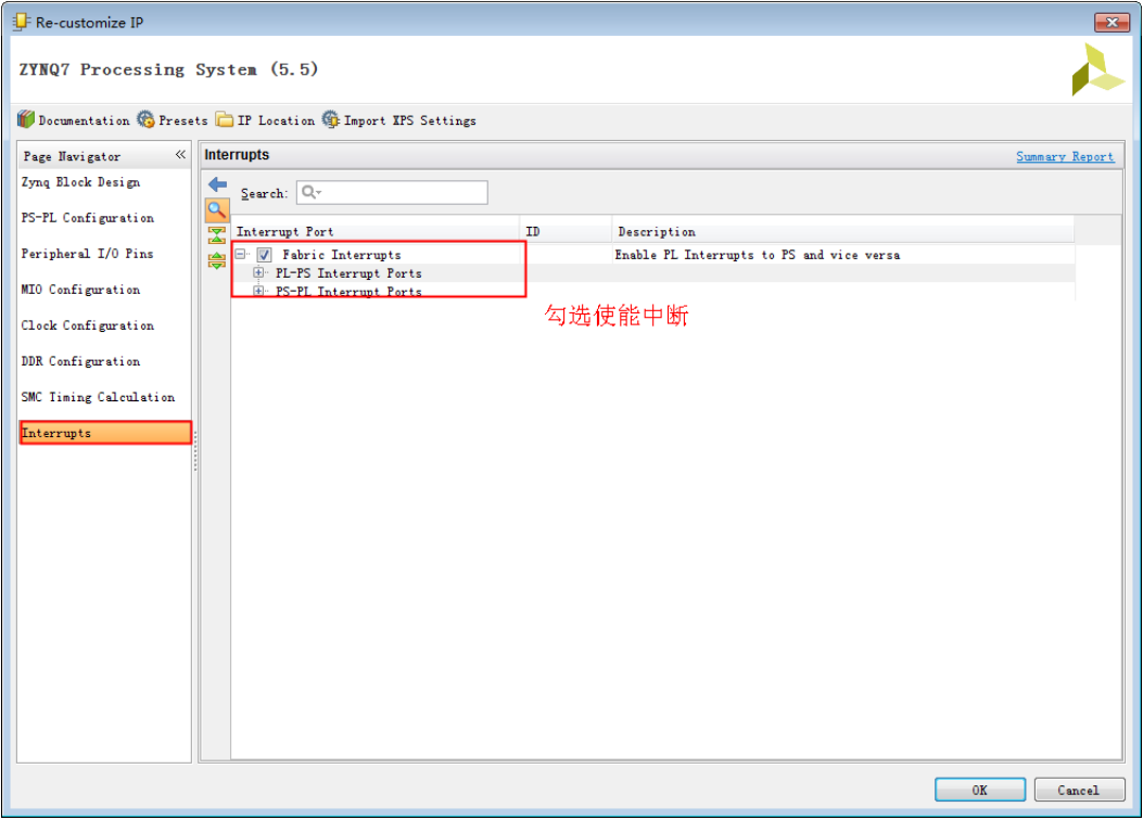 1.配置ZYNQ内核时需要将 Interrupts --- Fabric Interrupts 勾选上