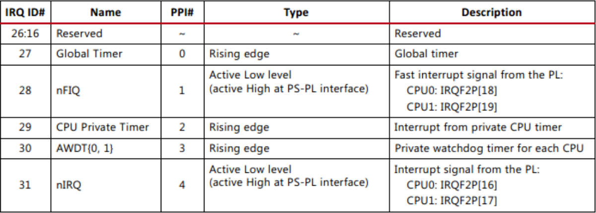 每个 CPU 连接一个私有的5个共享的外设中断,所有的中断敏感类型是固定的,不能修改。这里有 2 个 PL 到 CPU 的快速中断 nFIQ,私有中断包括 global timer、private timer 、watch dog 等。将来自 PL 的快速中断信号 FIQ 和中断信号 IRQ 翻转,然后送到中断控制器中。因此尽管在 ICDICFRI 寄存器内反映他们是活动低敏感信号,但是在 PS-PL接口为高电平活动。
